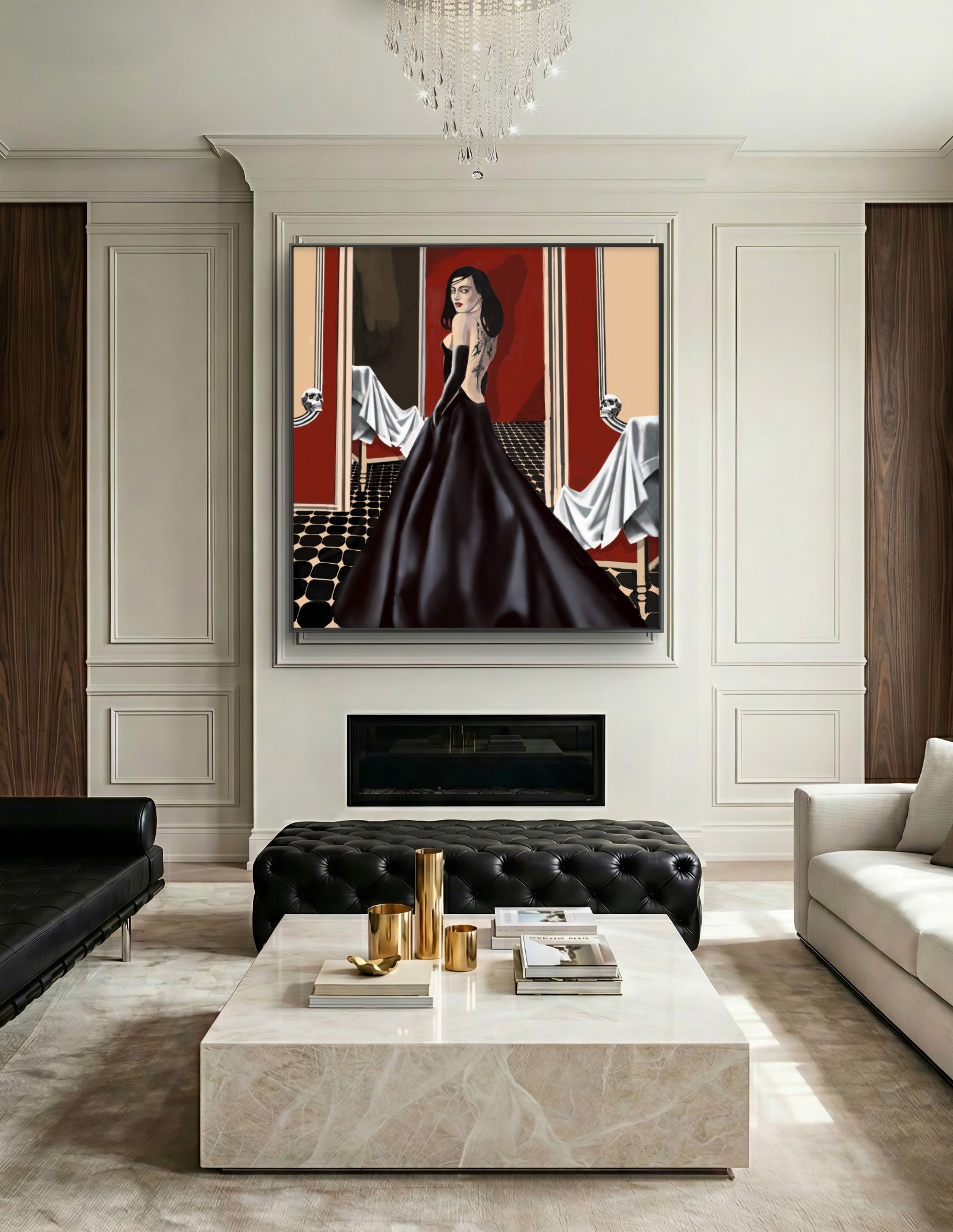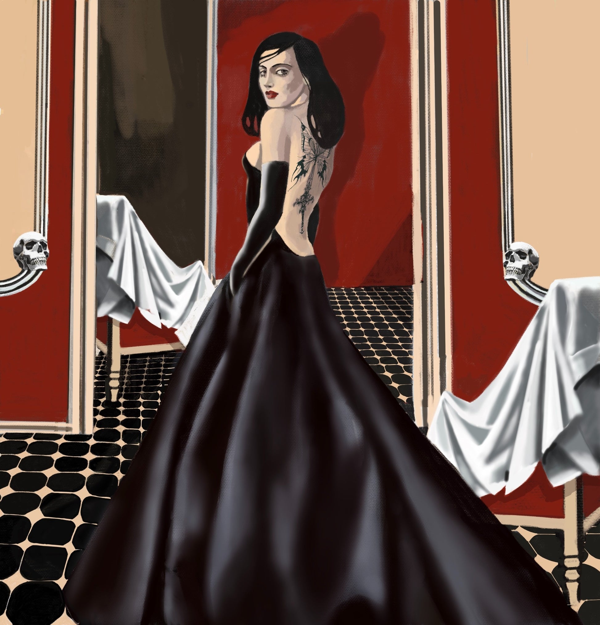 Motivet undersøker forholdet mellom skjønnhet, forgjengelighet og iscenesatt symbolikk gjennom en kvinneskikkelse plassert i et rom preget av historisk forfall. Komposisjonen balanserer eleganse og mørke, der arkitektoniske detaljer og ornamentale referanser forsterker verkets teatrale karakter.